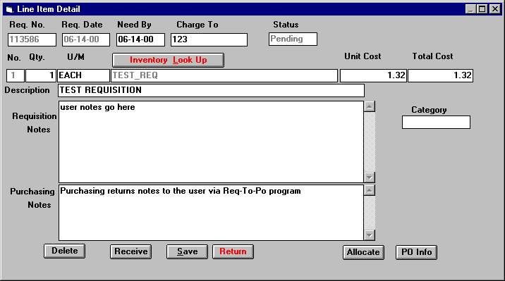 This program was developed to fill a gaping hole in the Solomon product line. Requisitions can be used in a small or large company to reduce the load of paper based reqs. It features a three level login procedure for users, approvers and supervisors. Reqs are validated by the Solomon inventory tables and, when approved they are forwarded to the Purchasing Department for further work and placement on a PO. Purchasing uses our Req-To-PO program for their research, editing and transferal process.